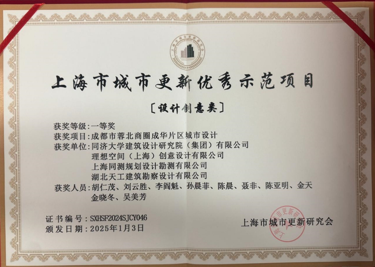 天工院聯(lián)合同濟(jì)大學(xué)建筑設(shè)計(jì)研究院(集團(tuán))有限公司、理想空間(上海)創(chuàng)意設(shè)計(jì)有限公司、上海同測(cè)規(guī)劃設(shè)計(jì)勘測(cè)有限公司設(shè)計(jì)的成都市蓉北商圈成華片區(qū)城市設(shè)計(jì)項(xiàng)目獲上海市城市更新優(yōu)秀示范項(xiàng)目(設(shè)計(jì)創(chuàng)意類)一等獎(jiǎng)。
